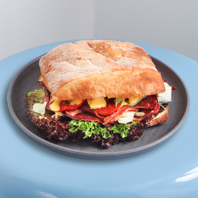 نان چاپاتا – بیکن – کاهو – گوجه – سس دست ساز